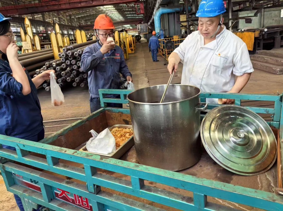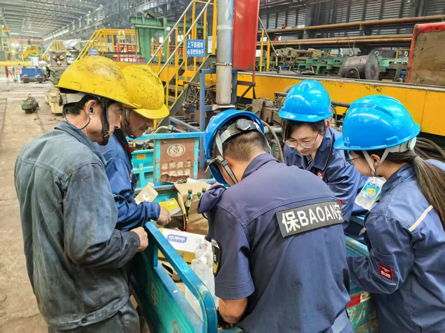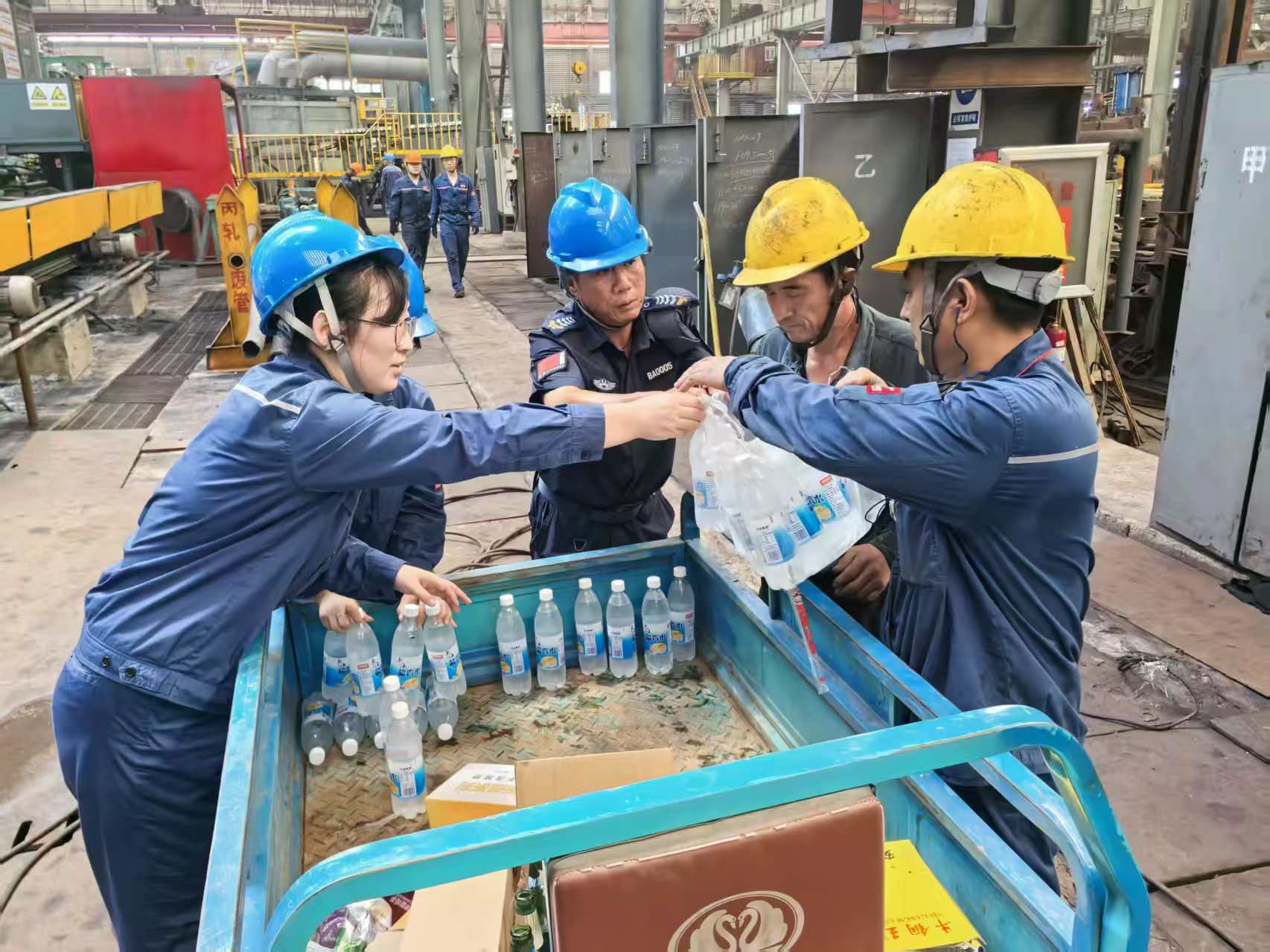 車間的活動(dòng)現(xiàn)場多點(diǎn)位同時(shí)進(jìn)行,保障人員為堅(jiān)守在一線的工人送去“防暑能量包”,包括綠豆湯,鹽汽水等飲品,把來自公司的“清涼”送到工人的心坎上,還貼心地囑咐工人要做好個(gè)人防護(hù),確保自身安全,工人們笑容滿面。